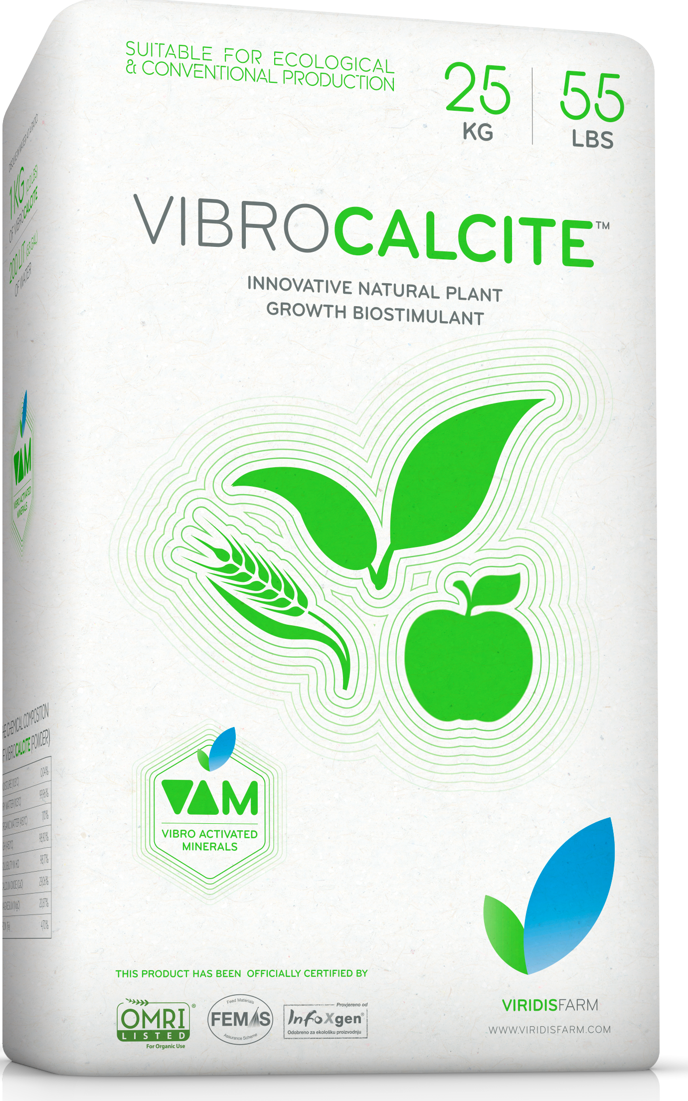 VibroCALCITE is a 100% natural mineral foliar growth enhancer intended for all chlorophyll plants (fields, farms and tree cultures), produced with unique patented VAM technology (vibro activation of minerals)